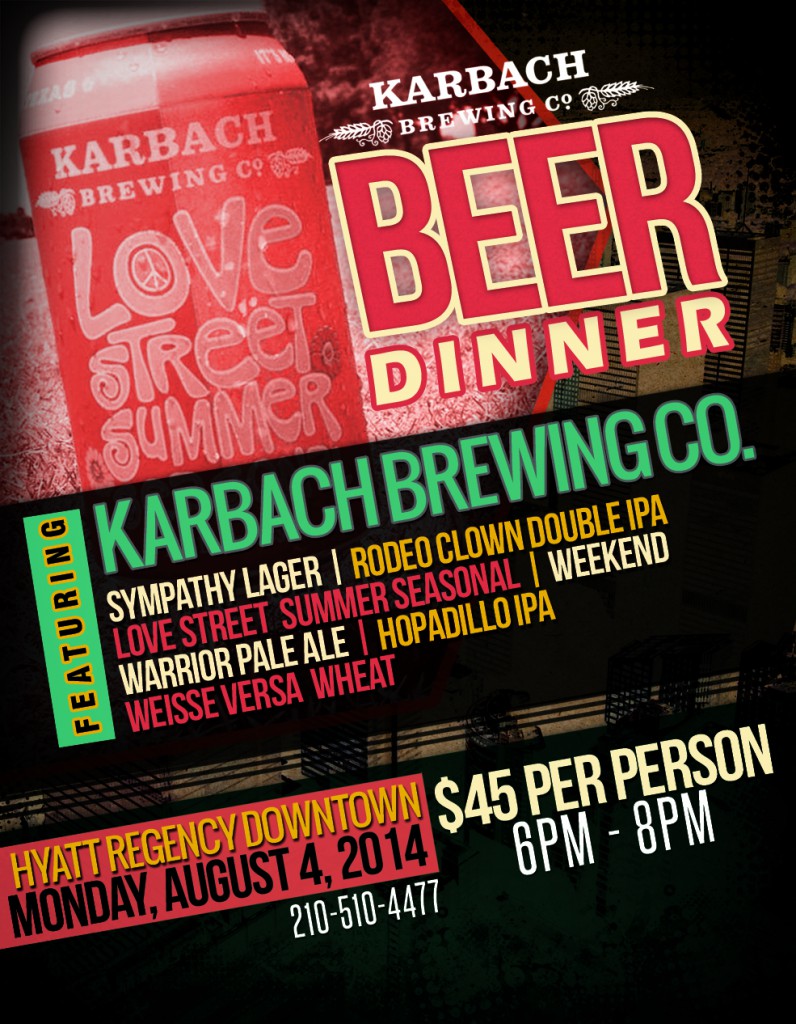 August 4, 2014 from 6pm-8pm $45 per person 210.510.4477 Reception with Passed Hors d’oeuvre -Sympathy Lager: crispy potato and charred corn spring roll with sweet jalapeno ketchup -Rodeo Clown Double IPA: karbach glazed pork belly -Love Street Summer Seasonal: brazos valley smoked gouda cheese sticks